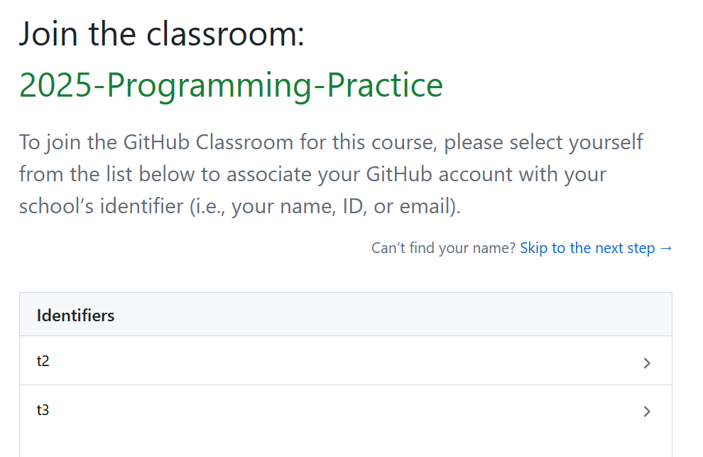 GitHub Classroomへの接続が初めての場合,自分の学籍番号と紐付けるページに遷移するので,自分の学籍番号をクリックしてください. (間違えた場合,教員・TAに申し出てください)