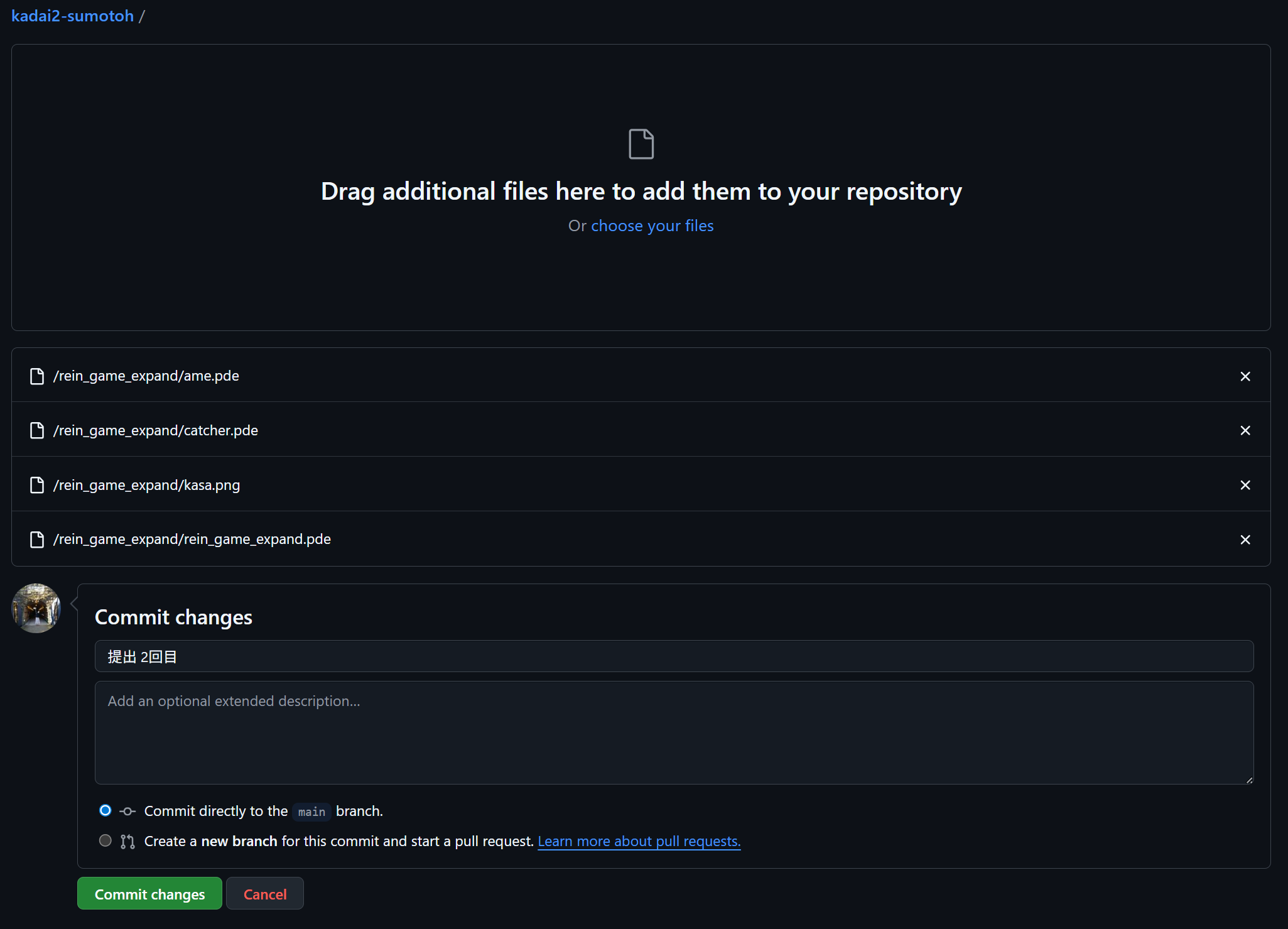Drag additional files here to add them to your repositoryという場所に,提出したいProcessingコードが入っているフォルダをドラッグ&ドロップしてください.ここでも,(create new fileで提出する場合と同じように)A/A.pdeというようにメインとなるファイルの名前はフォルダ名と同一であることを確認してください.