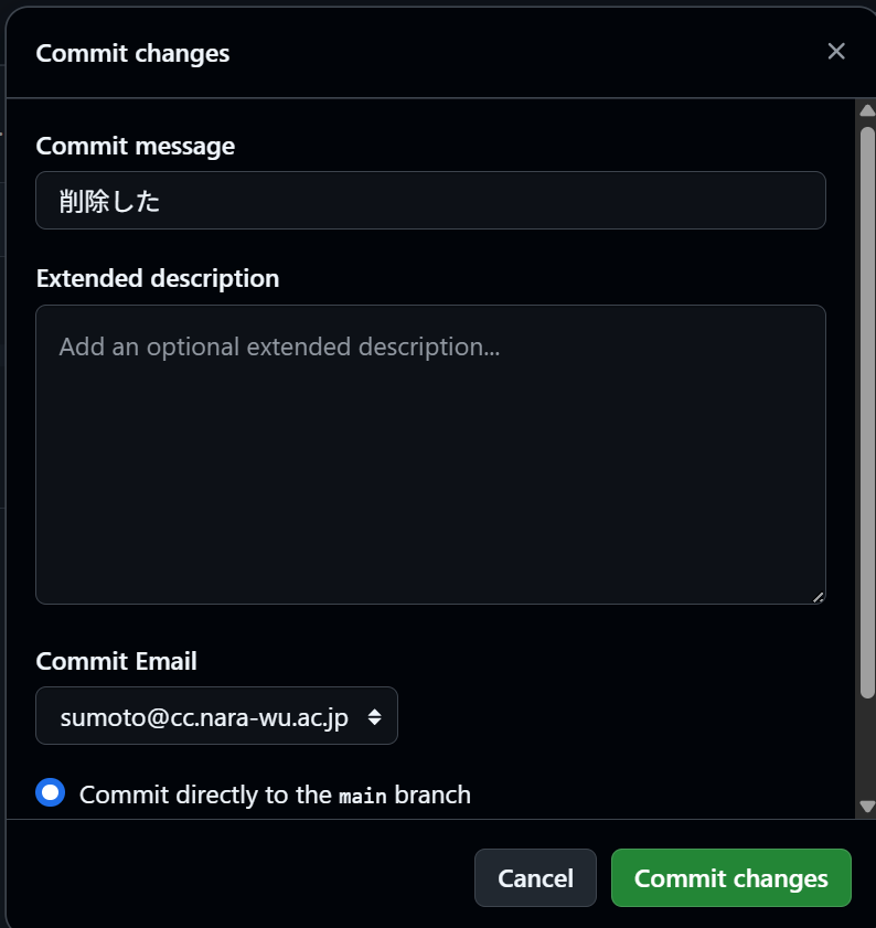 どちらの場合も,削除したあと,必ず緑色のCommit changesボタンから削除したという事象を保存してくだい.